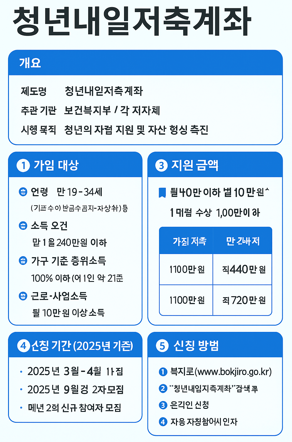청년내일저축계좌는 근로·사업소득이 있는 청년이 일정 금액을 저축하면 정부가 추가로 지원금을 매칭해주는 자산형성 지원사업입니다. 복지로(www.bokjiro.go.kr)에 따르면, 본 제도는 근로 의지가 있는 청년층의 자산형성과 경제적 자립을 돕기 위해 설계된 대표 청년복지정책입니다. 월 10만 원을 3년간 꾸준히 저축하면 정부가 동일 금액을 적립해 최종적으로 최대 1,440만 원(이자 포함)을 받을 수 있으며, 소득 수준에 따라 지원금 규모가 달라집니다. 특히 청년내일저축계좌는 단순 저축이 아니라 금융교육, 복지연계, 자산관리 코칭 등 통합형 청년자립지원 프로그램으로 운영되고 있습니다. 본 글에서는 복지로의 공식 정보를 기준으로 청년내일저축계좌의 목적, 가입조건, 신청절차, 지원혜택, 실제 사례를 체계적으로 분석하여 청년이 꼭 알아야 할 핵심 내용을 제공합니다.